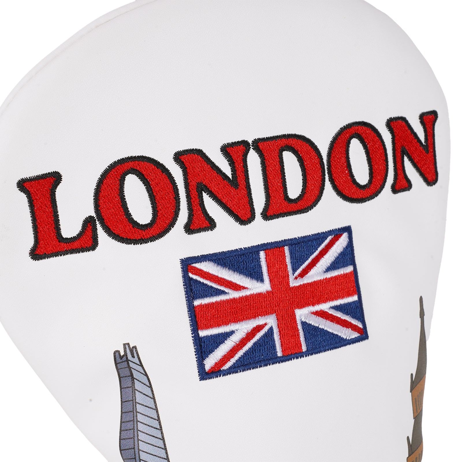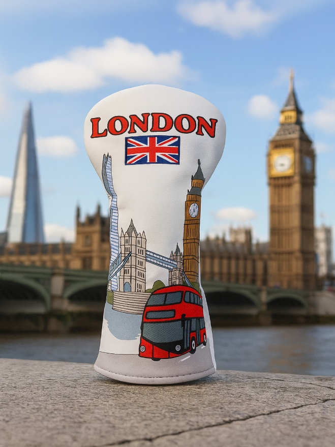 Show off your love for London on the golf course with this premium PU leather driver headcover. Designed for style and durability, this eye-catching cover features high-quality embroidery of some of London’s most iconic landmarks: Big Ben, The Shard, Tower Bridge, and the classic red double-decker bus. Topped off with the Union Jack and bold "LONDON" lettering, it's a perfect blend of heritage and function.